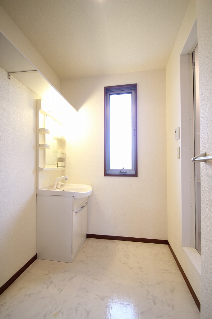 水回りもご紹介しますね。まずは清潔感のある洗面所です。忙しい朝も使いやすい、シャワー付きの洗面台ですよ。