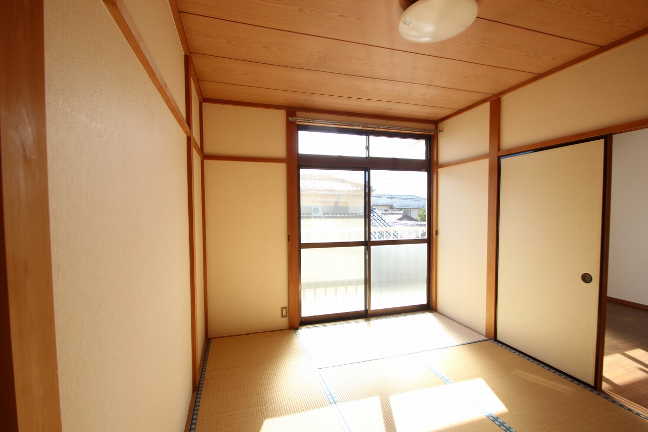 こちらは陽当たり抜群の洋室です。南向きの窓からたっぷりの光が差し込んで、お部屋全体が明るい雰囲気ですよね。エアコンも設置されているので、入居後すぐに快適な暮らしが始められます!