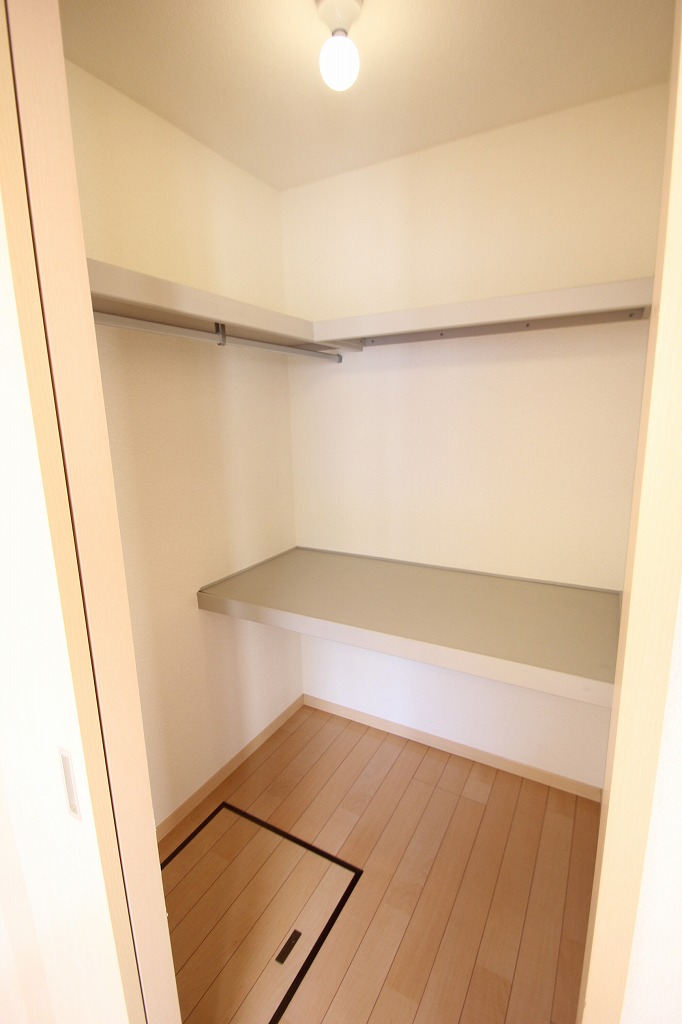 実は、ウォークインクローゼットもあるんです!季節物のお洋服や、かさばる荷物もすっきり片付きますよ。収納が多いと、お部屋を広く使えるので嬉しいですよね!