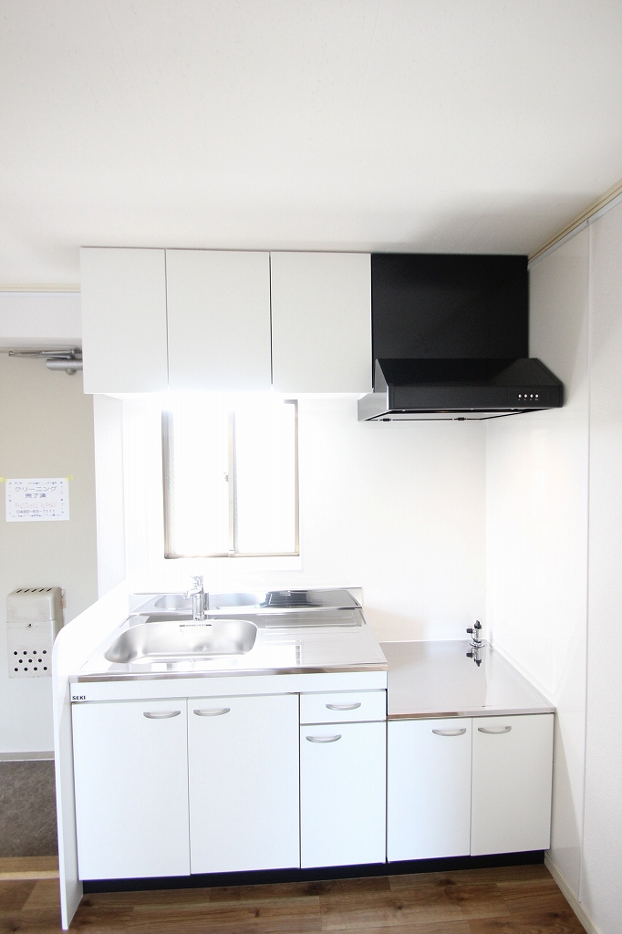 清潔感のある白いキッチンは、窓があるので換気がしやすいです。これなら朝食の準備も気持ちよくできそうですよね。もちろん都市ガス対応なので、光熱費も抑えやすいのが嬉しいポイントです!