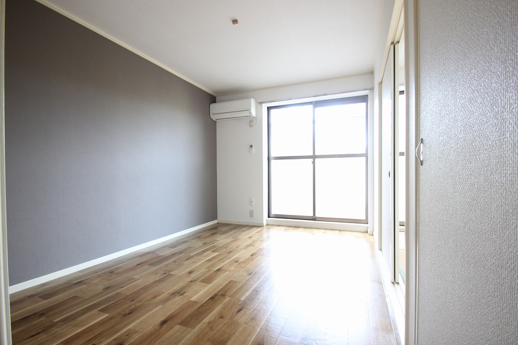 洋室はグレーのアクセントクロスですごく落ち着いた雰囲気ですね。もちろんエアコンも完備しているので、一年中快適に過ごせますよ。