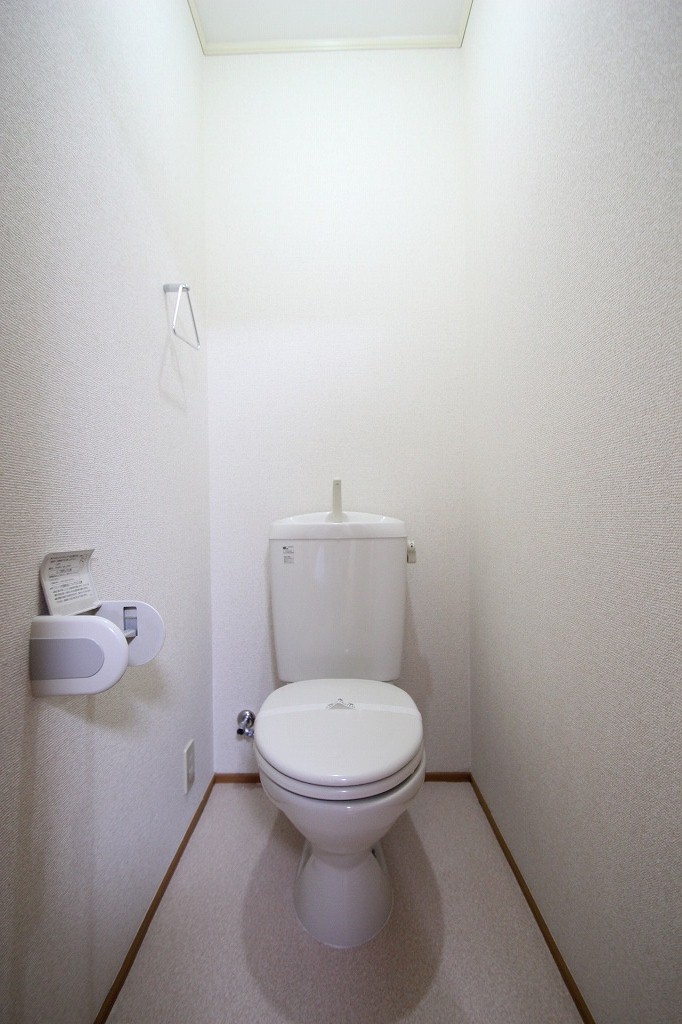 シンプルで清潔感のある空間です。トイレットペーパーホルダーやタオル掛けもきちんと設置されていますね。