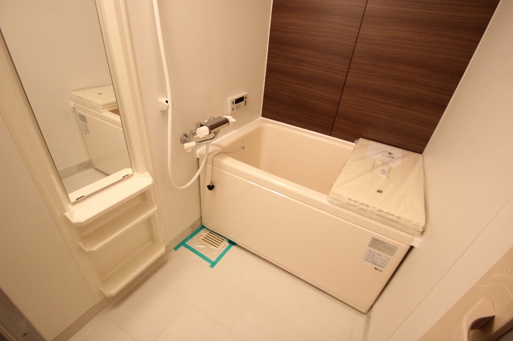 ▽お風呂は棚付きなので、ヘアケア用品も収納可能!