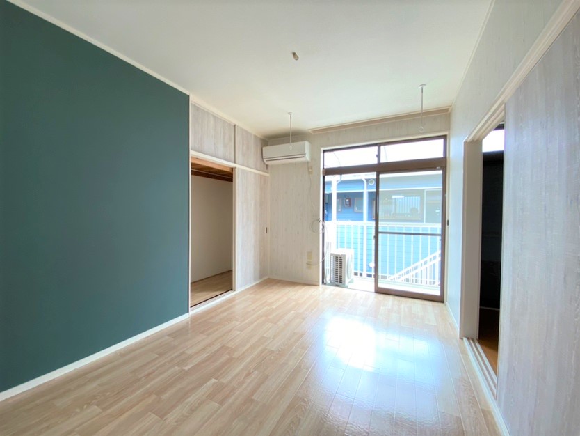 洋室に入るとグリーンのアクセントクロスが目を引きます。